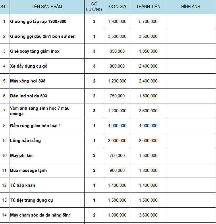 Lưu ý: Bảng báo giá này chỉ áp dụng cho đơn hàng trọn gói thiết bị spa, giá trên có thể thay đổi tăng hoặc giảm, tùy theo mỗi đơn hàng và thời gian mua hàng, liên hệ với chúng tôi để được tư vấn và báo giá tốt nhất!