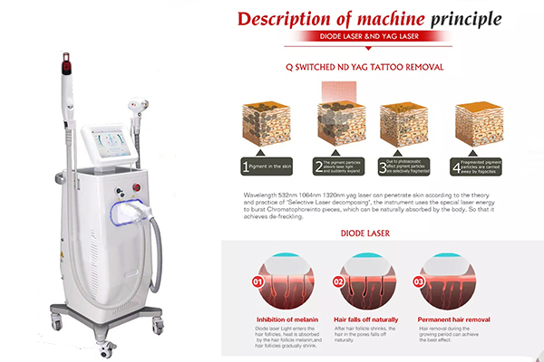 Máy triệt lông xóa xăm Diode Laser 2 trong 1 có thiết kế rất đẹp, tinh tế và hiện đại, khả năng hoàn thiện cao cấp, có bánh xe dễ dàng di chuyển và thời gian bảo hành lâu dài. Máy triệt lông xóa xăm Diode Laser 2 trong 1 giúp xóa khuyết điểm trên da kể cả các vết đốm, tàn nhàng, hình xăm. Chức năng Diode triệt lông hiệu quả, có thể triệt lông trên nhiều vùng của cơ thể.