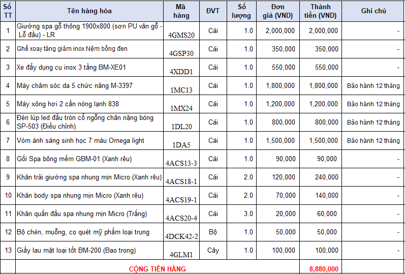 Lưu ý: Bảng báo giá này chỉ áp dụng cho đơn hàng trọn gói thiết bị spa, giá trên có thể thay đổi tăng hoặc giảm, tùy theo mỗi đơn hàng, liên hệ với chúng tôi để được tư vấn và báo giá tốt nhất!