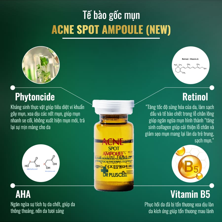 Sau nhiều nghiên cứu, các chuyên gia Dr Pluscell đã sử dụng sự kết hợp đỉnh cao giữa 2 hoạt chất là Retinol và Phytoncide vào trong sản phẩm ACNE SPOT AMPOULE giúp kiểm soát 85% mụn, 75% dầu thừa và 55% thâm mụn chỉ trong vòng 28 ngày mà vẫn bảo vệ được nền da khỏe mạnh tự nhiên. Có thể kết hợp với các kỹ thuật khác như lăn kim, phi kim, laser.