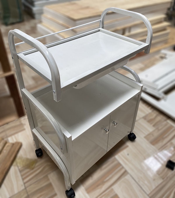 Xe đẩy dụng cụ sắt sơn tĩnh điện mặt MDF có hộc tủ AH-06 được thiết kế chắc chắn, rất đẹp mắt kết hợp với hộc tủ gỗ lớn rất tiện lợi cho kỹ thuật viên thao tác, lấy dụng cụ. Xe đẩy sắt sơn tỉnh điện mặt kiếng có khay đựng nước, dụng cụ spa, thân xe đẩy với kiểu dáng nhỏ gọn, sang trọng nên được rất nhiều các trung tâm thẩm mỹ viện, spa, phòng khám ưa chuộng hiện nay.